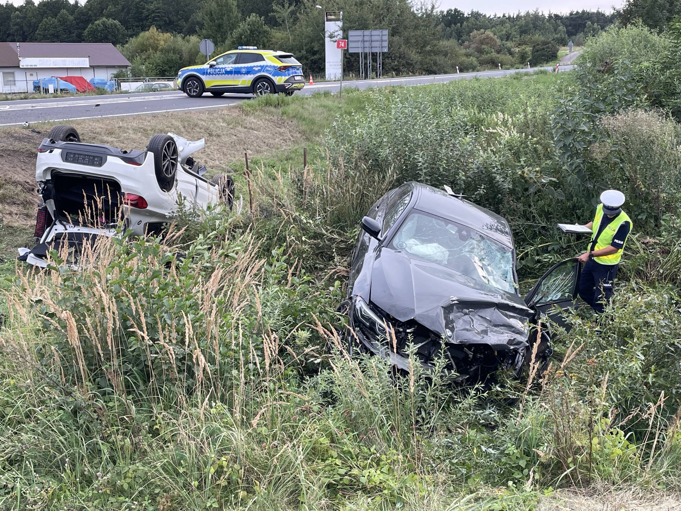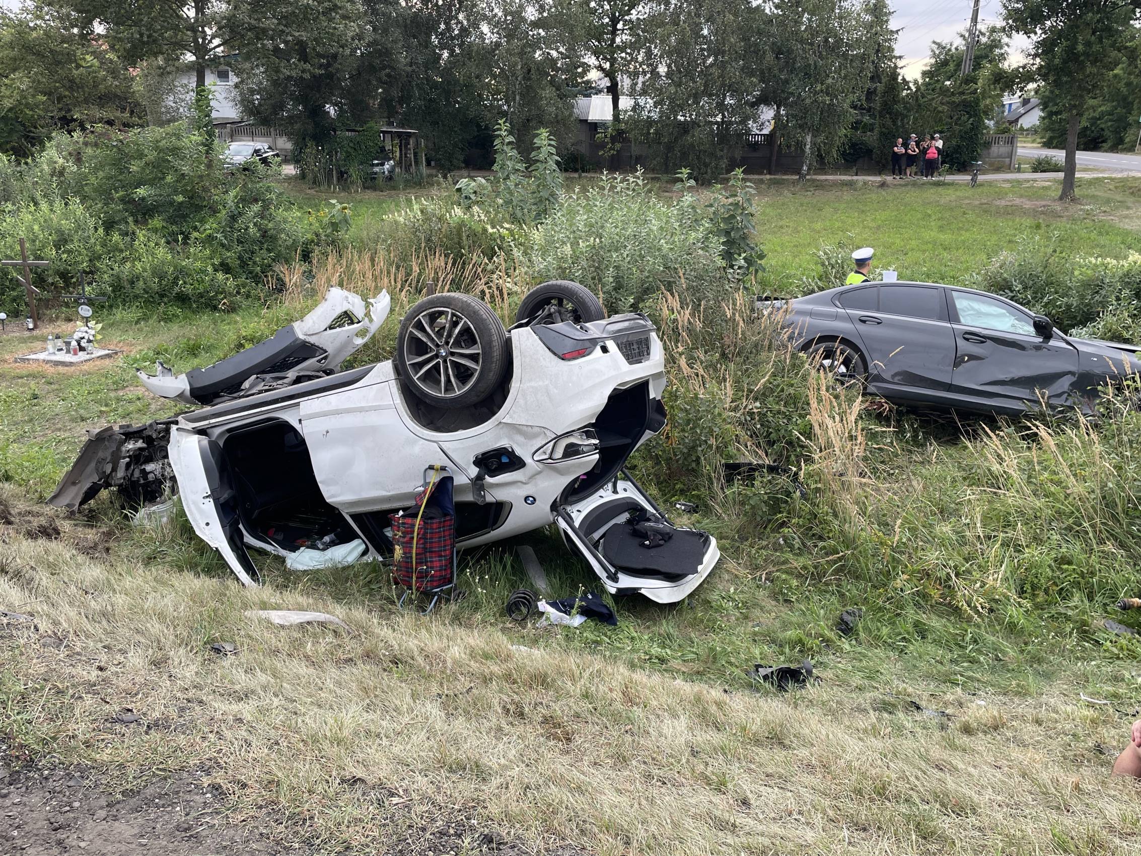 Ze wstępnych ustaleń policji wynika, że kierująca BMW X2, 42-letnia kobieta jadąca drogą wojewódzką nr 480, nie zastosowała się do znaku "STOP" i nie ustąpiła pierwszeństwa przejazdu prawidłowo jadącemu drogą krajową 48-latkowi, kierującemu BMW serii 3. Siła zderzenia obu pojazdów była na tyle duża, że oba auta wypadły z drogi i spadły ze skarpy i finalnie jedno z nich dachowało.