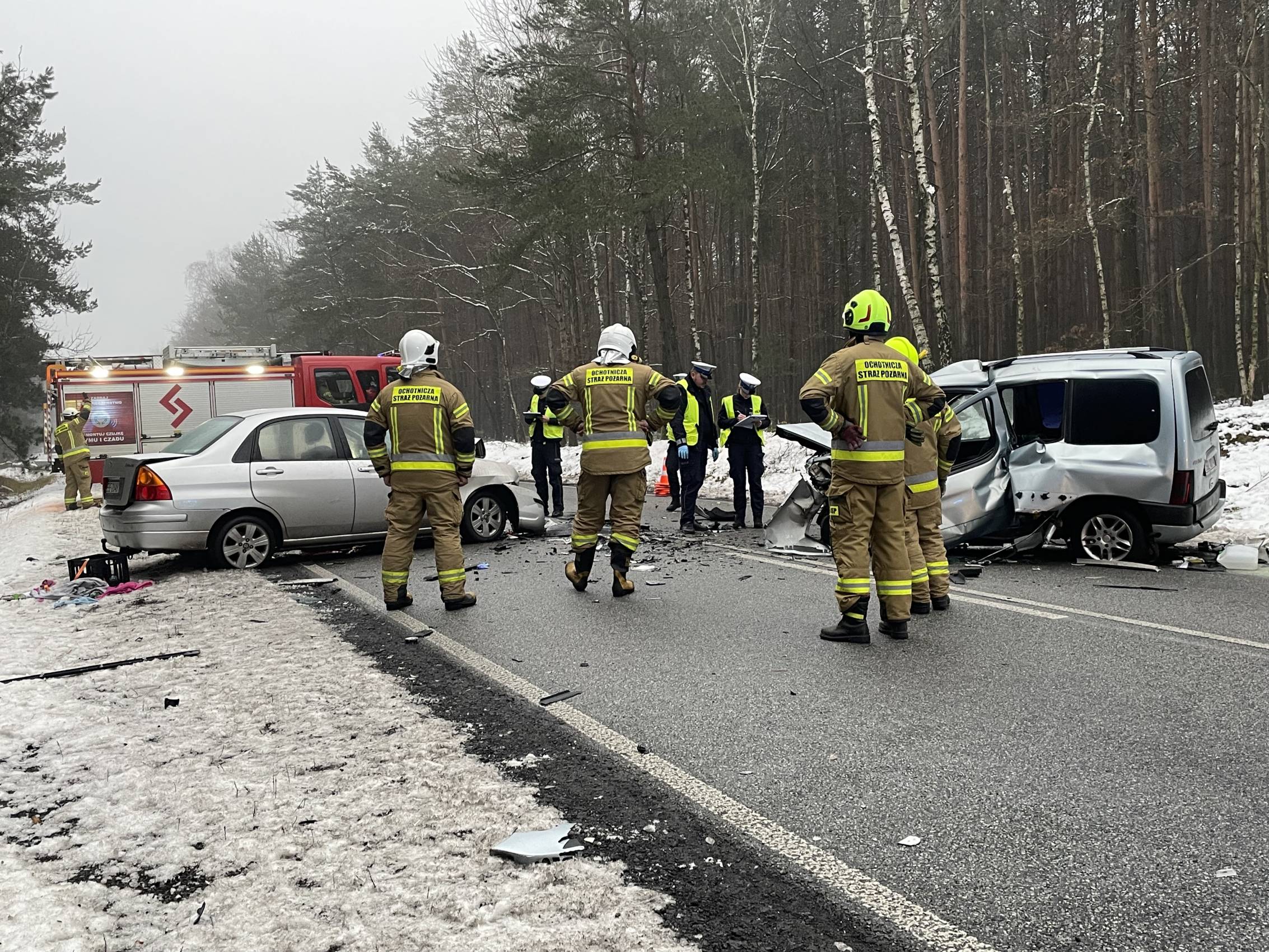 Na miejscu pracują policjanci, strażacy oraz prokurator, którzy ustalają dokładne okoliczności zdarzenia. Droga krajowa pozostaje całkowicie zablokowana, a utrudnienia mogą potrwać jeszcze około dwóch godzin.